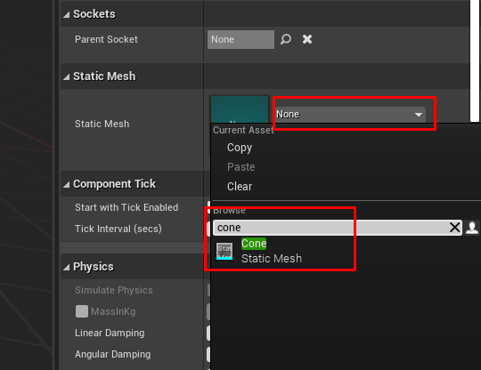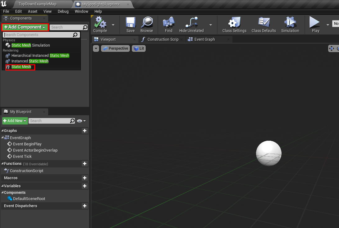 - 생성된 Blueprint를 더블클릭한후 Add Component를 클릭하고 다음과 같이 mesh를 선택해 add한다.