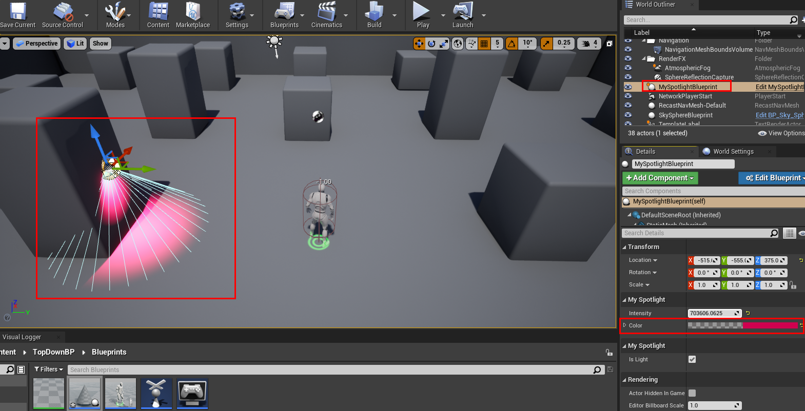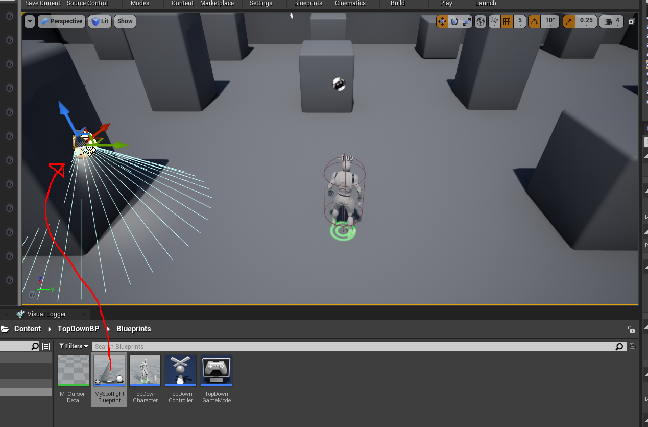 - 이젠 View port에 spotlight blueprint 를 드래그하여 객체를 생성한후 위치조절을 한다.