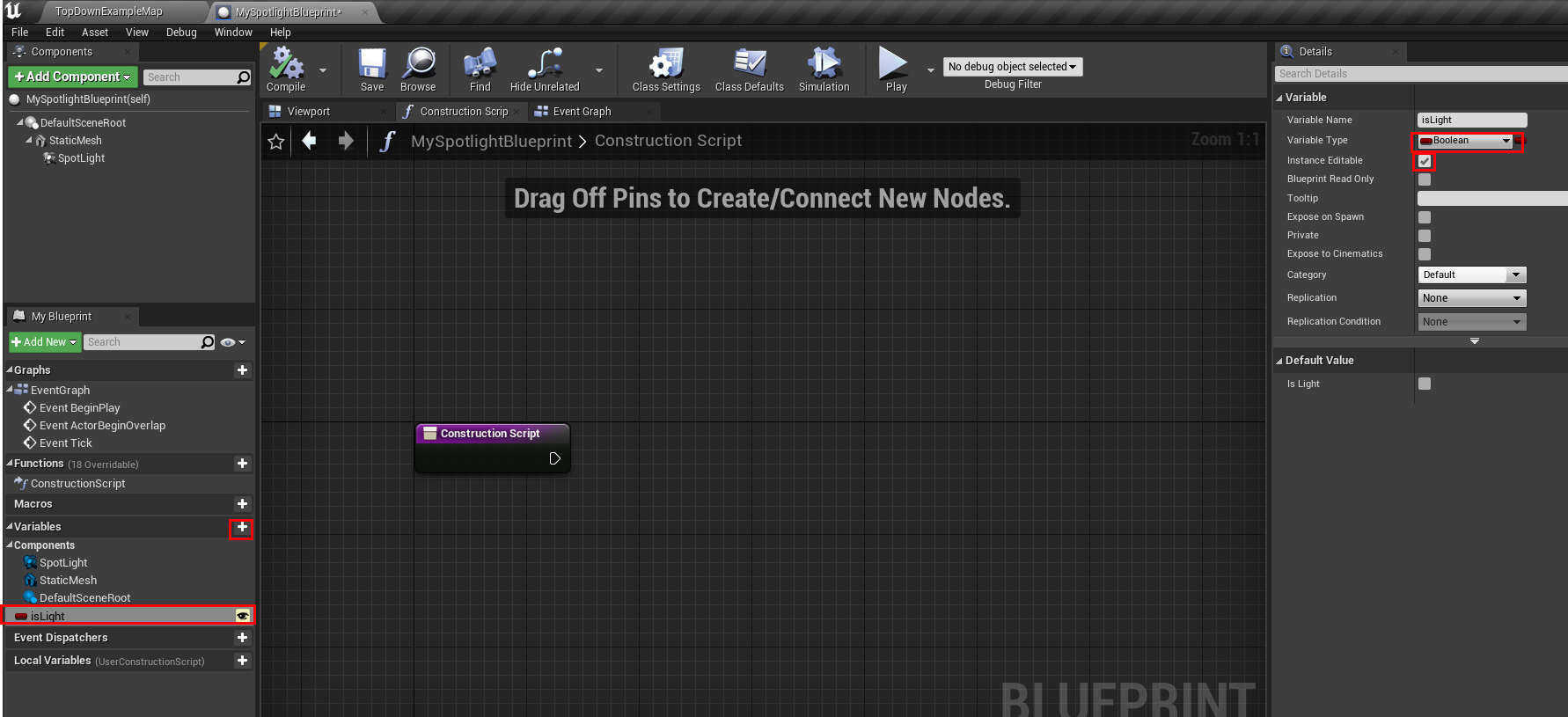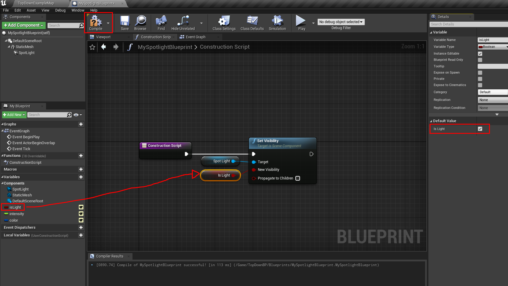- Construction script 창에서 오른쪽 버튼을 눌러 set visibility(spot light)를 클릭한다.
