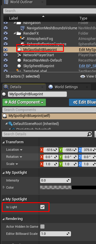 - 생성된 붙여진 Static Mesh와 Spot light의 크기화 방향을 다음과 같이 변경한다.