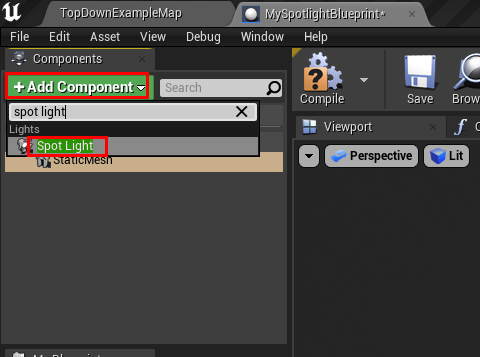 - 다시 Add Component를 클릭하여 spot light를 추가한다.