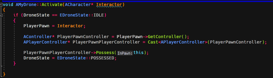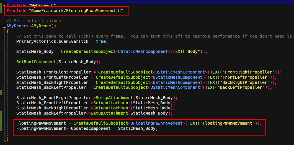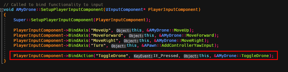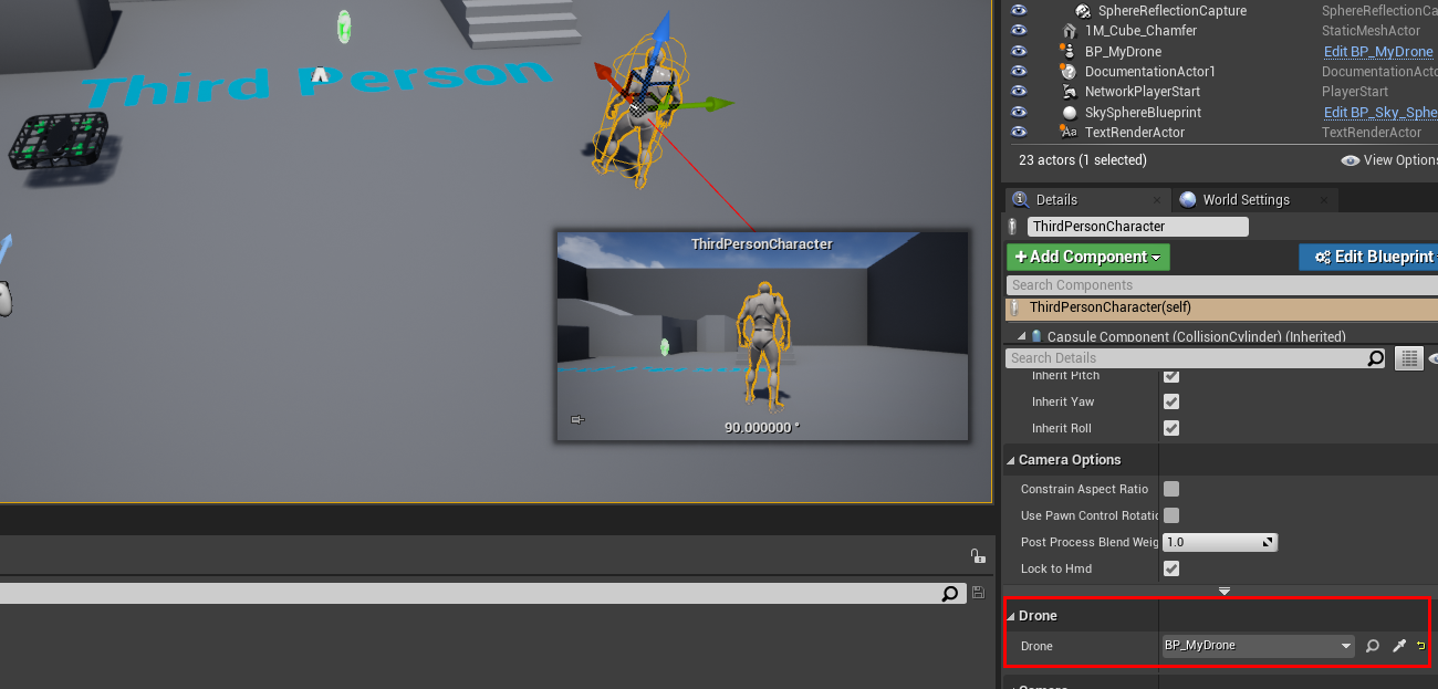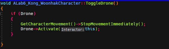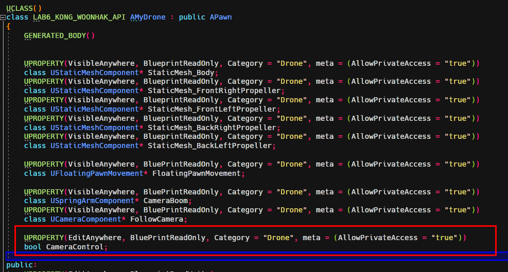 ThirdPerson 예제를 C++ 로 만든후, MyDrone 클래스를 생성후 다음과 같이 작성한다.